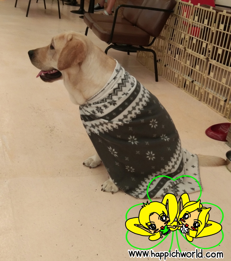 방문했던 아이들이 손님용 담요를 망토처럼 크림이에게 둘러줬네요.ㅎㅎ