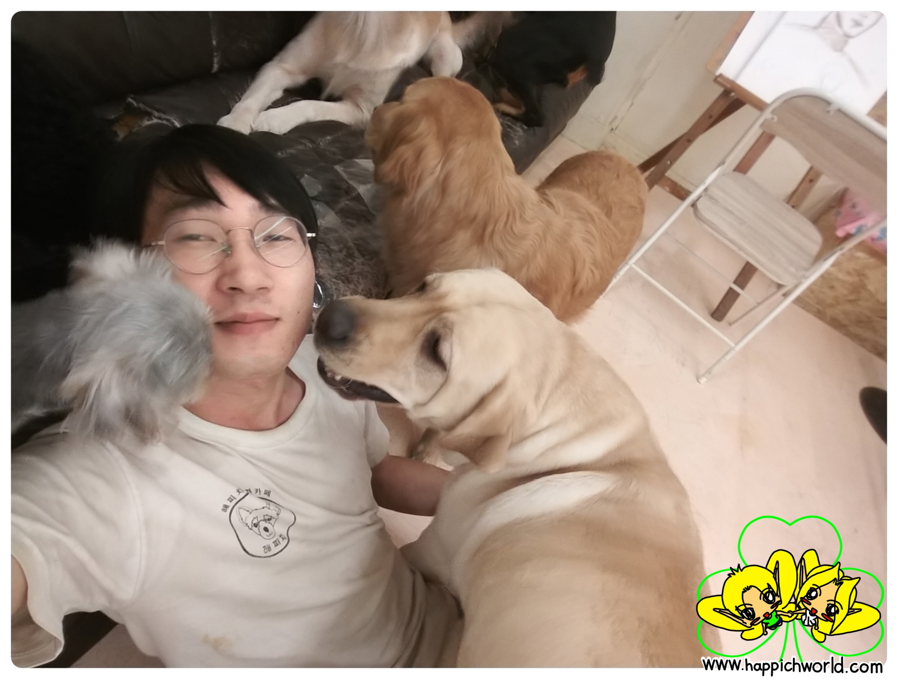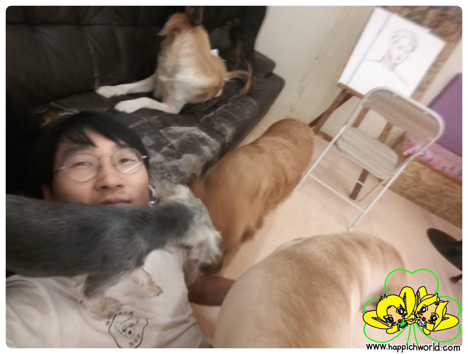 메리, 해피, 크림이... 심지어 뒤에 있는 손님 강아지인 통키까지도,,,,