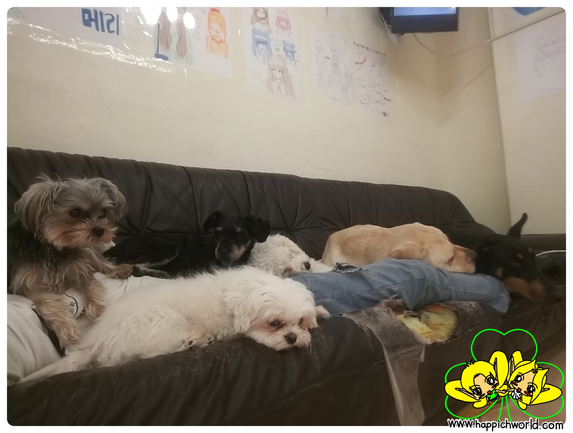 소파 위에서 해피, 구름, 밀키, 크림이, 그리고 손님 강아지인 땅콩이와 탄이까지...ㅋ