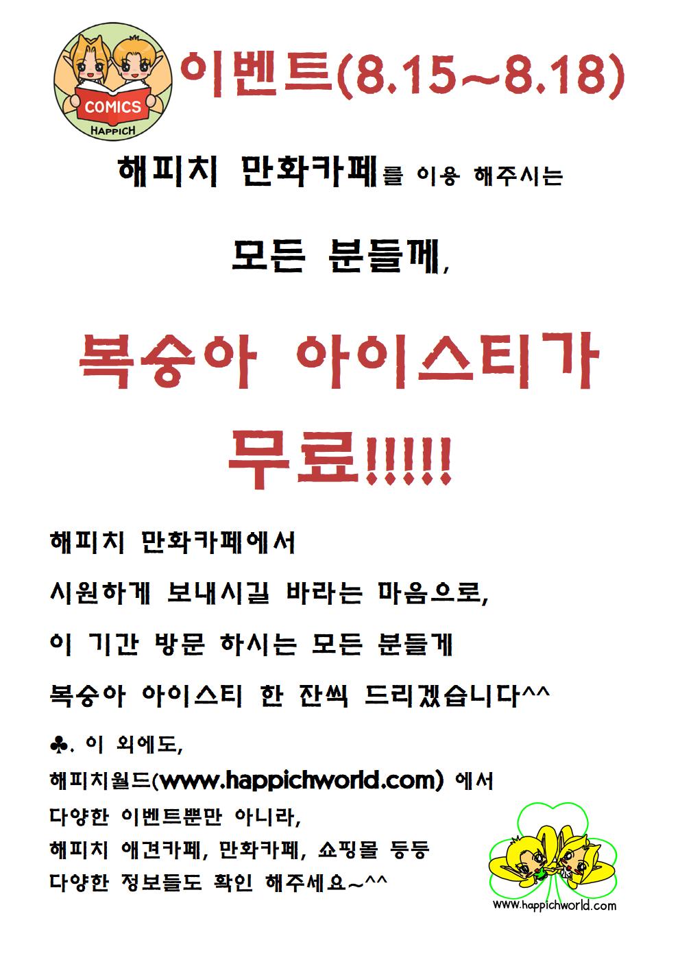 해피치 만화카페를 이용하시는 모든 분들께 아이스티를 무료로 한 잔씩 드리겠습니다^^