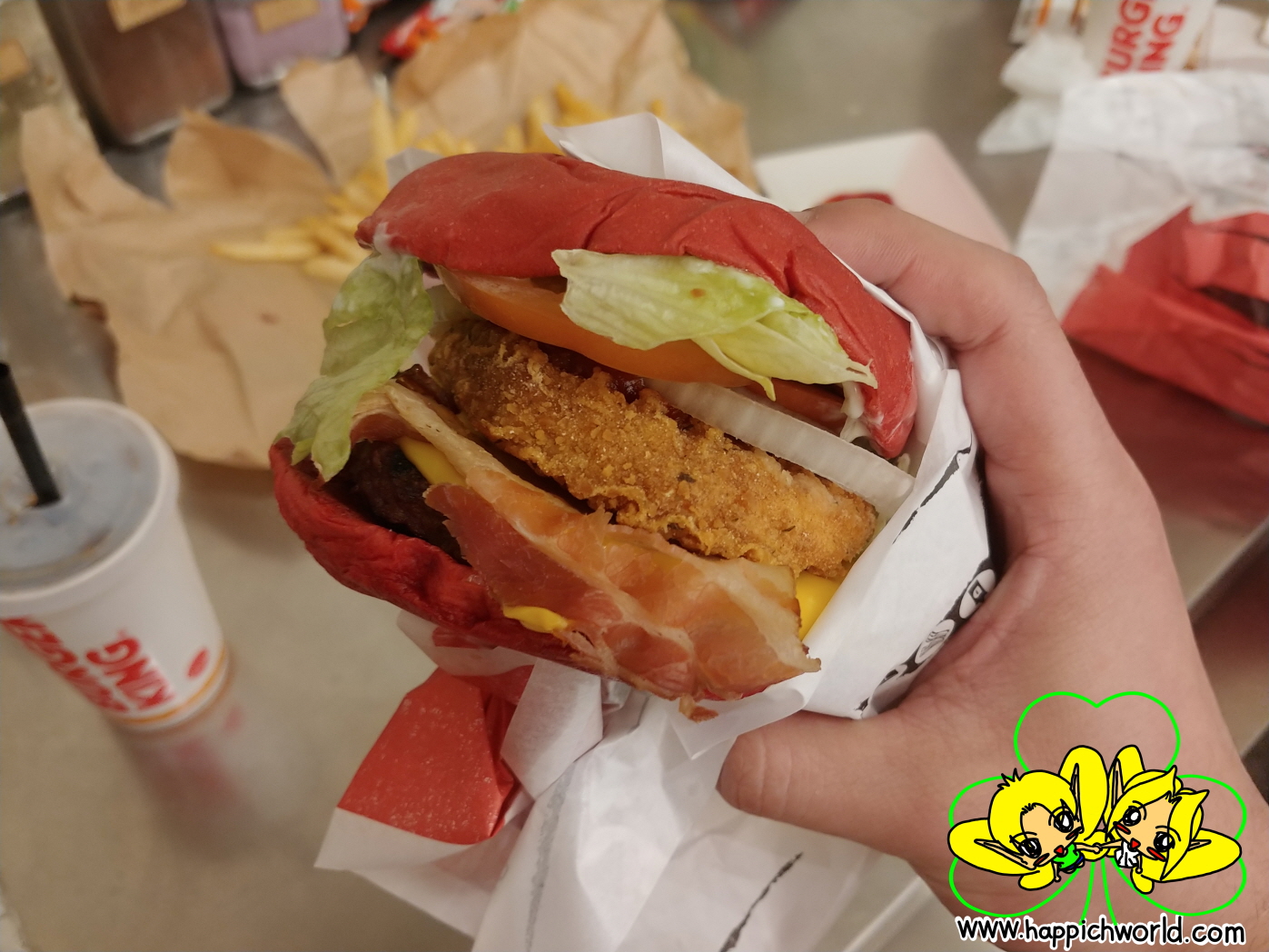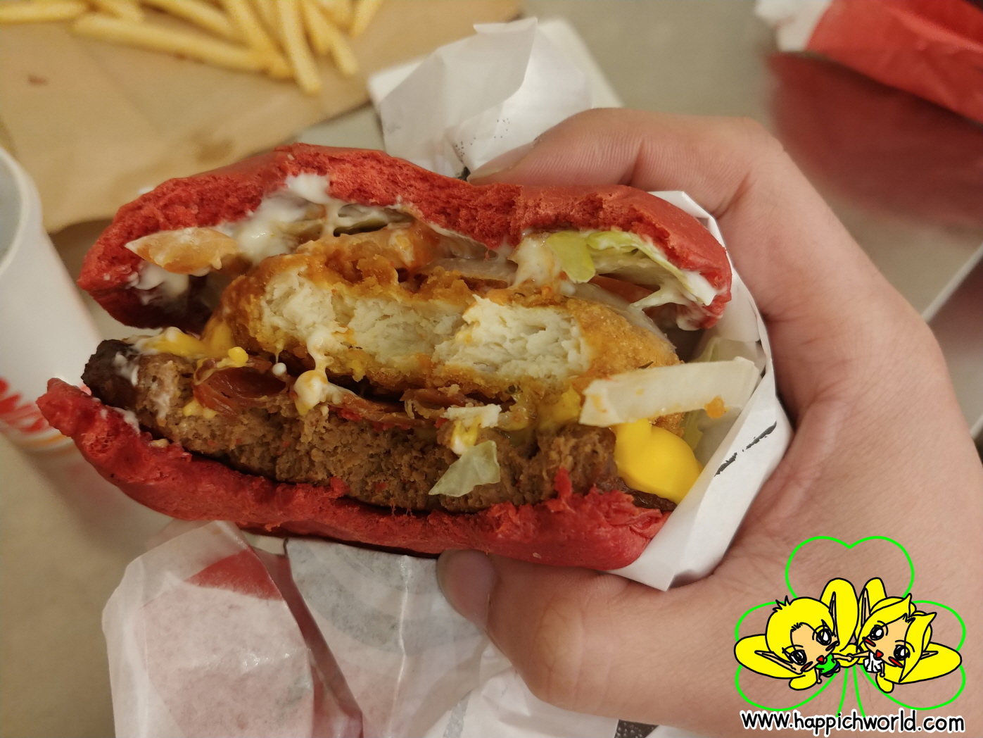 게다가 햄버거 빵이 특이하게 빨간색이네요.ㅎㅎ