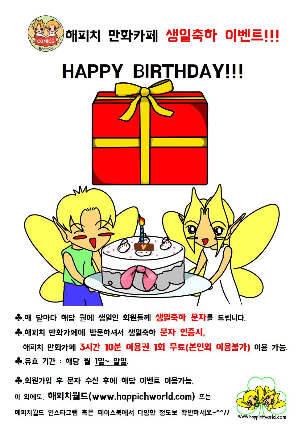 생일이벤트 관련 문자 받으신 분들은 해피치 만화카페에 방문하셔서 문자 인증시