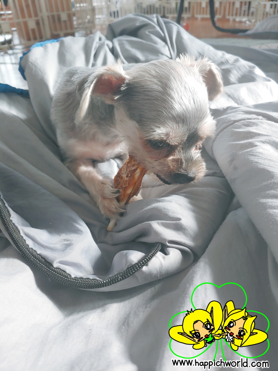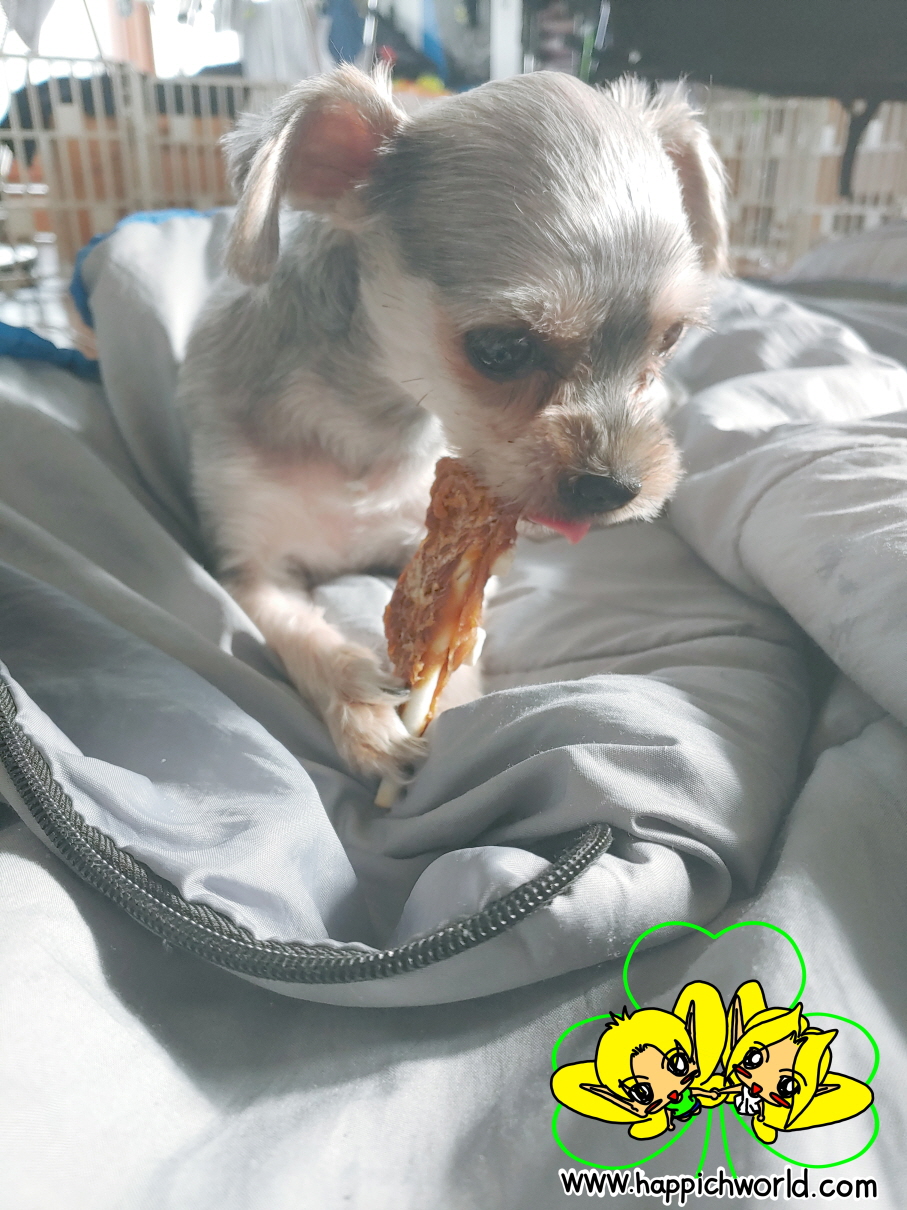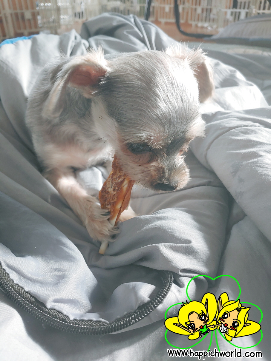 해피에게 간식을 주니,