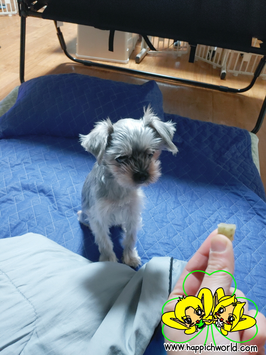 움직이는 대로 해피의 눈빛이 간식을 놓치지 않고 잘 따라오네요.ㅎㅎ