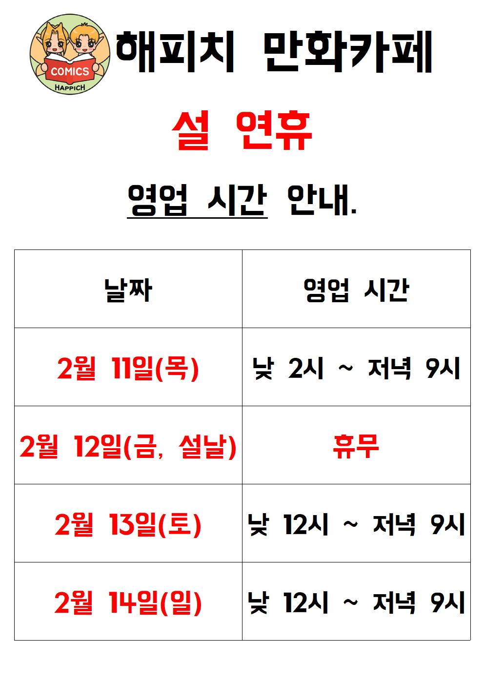 해피치 만화카페 설 연휴(2/11~2/14) 일정 안내.