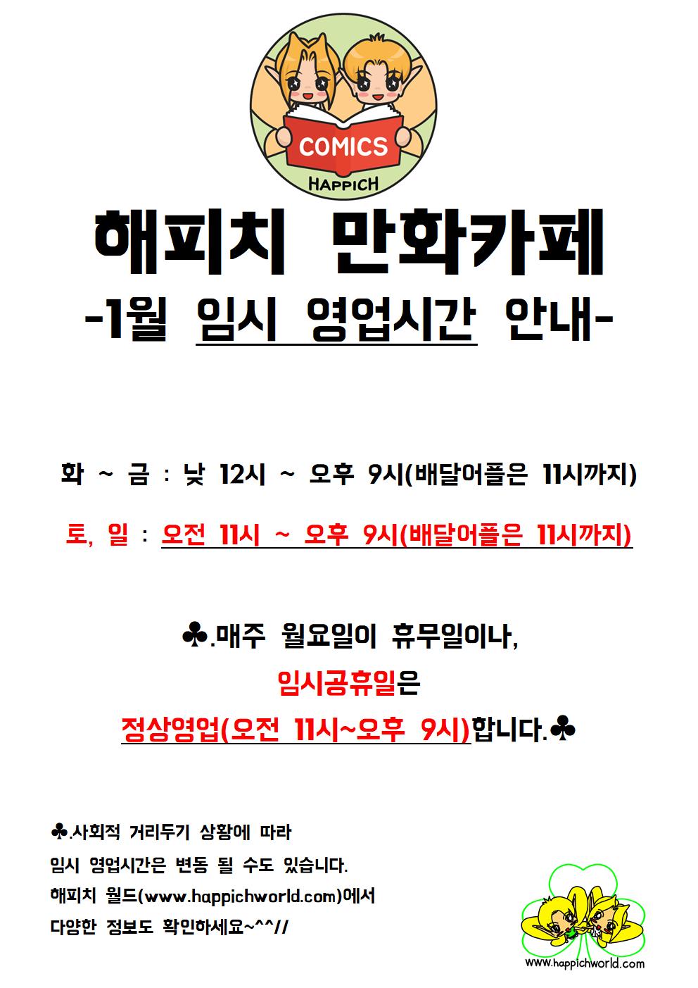 | 해피치 만화카페 10월 임시 영업시간 안내. (0) | 2021.09.29 |