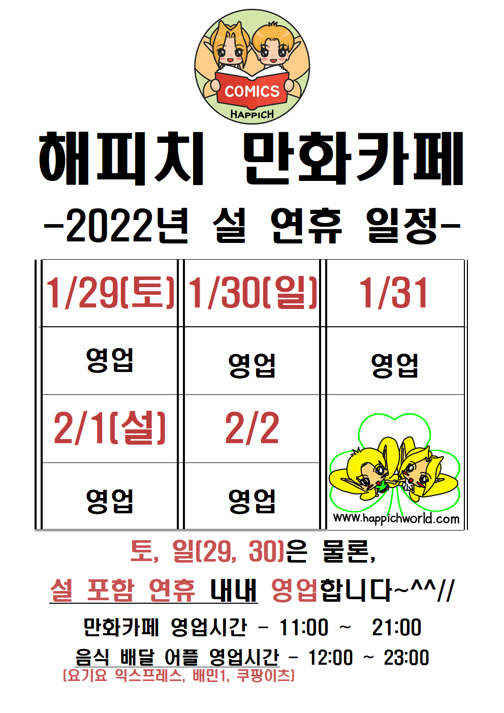 해피치 만화카페 2022년 설 연휴 영업 안내