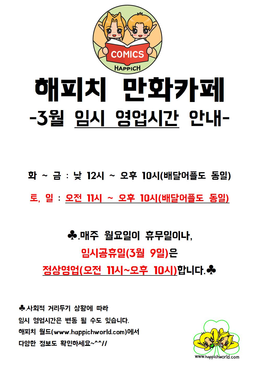 | 해피치 만화카페 4월 임시 영업시간 안내. (0) | 2022.04.07 |
