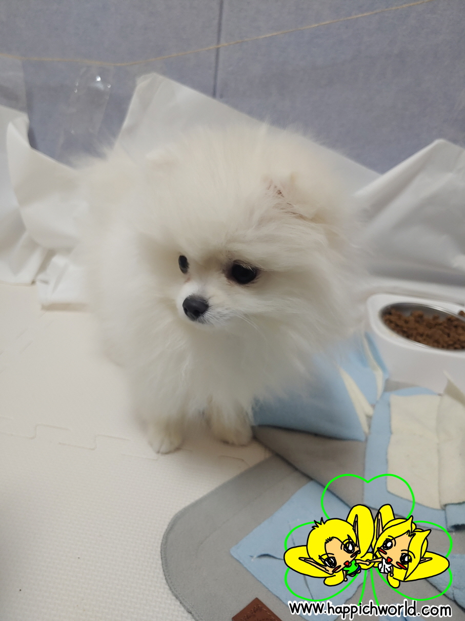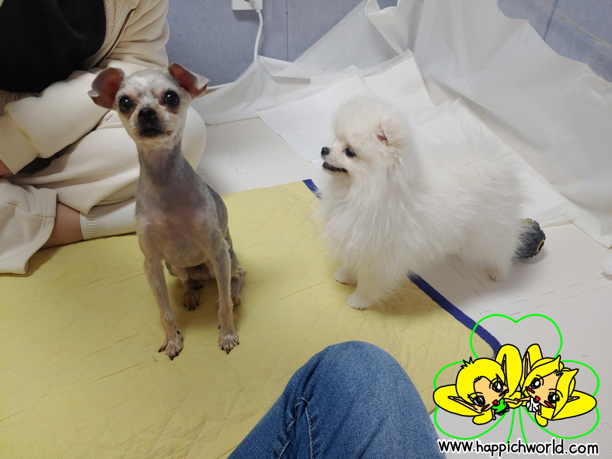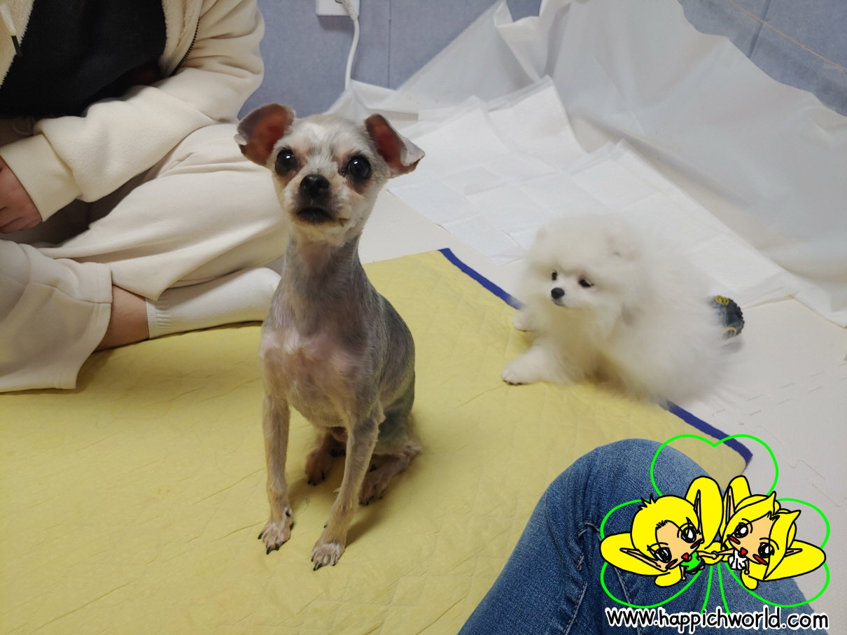 털을 짧게 밀어서 해피가 앙상한 모습인데