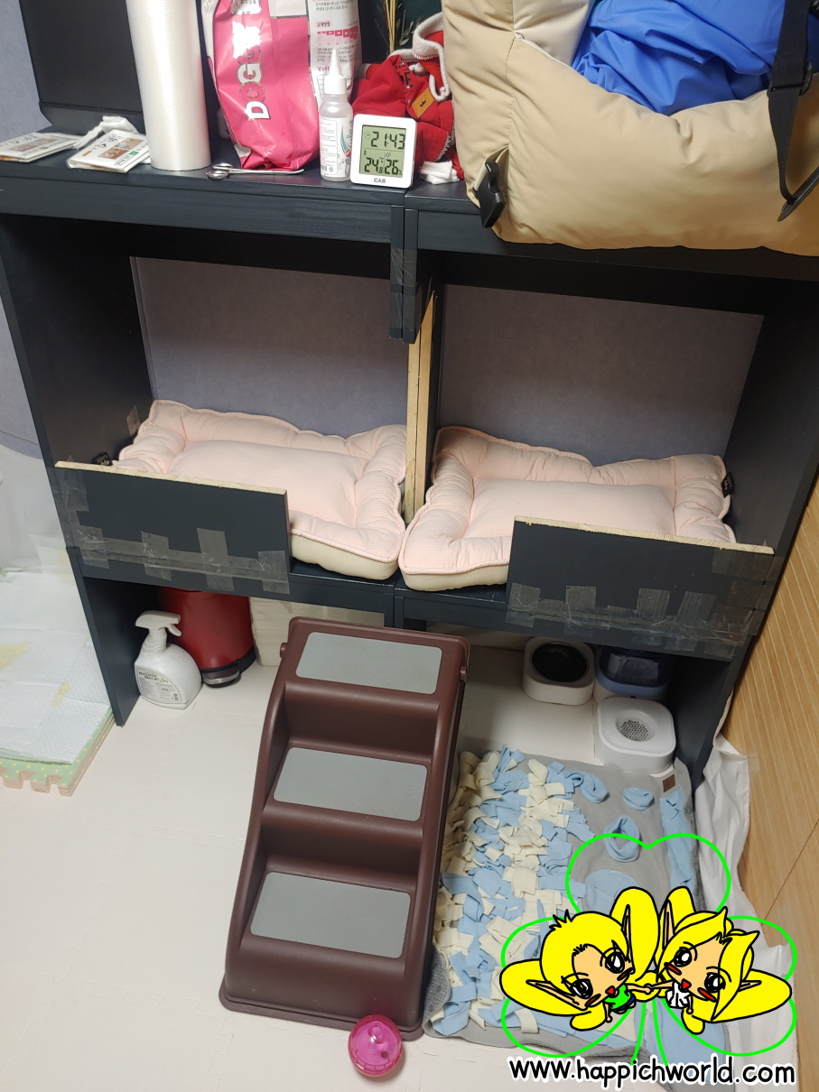 그래서 해피의 공간을 여기로, 저기로 이리 저리 옮겨 가며