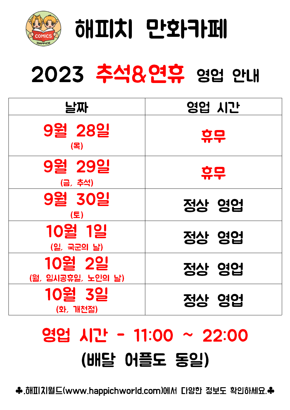 2023 해피치 만화카페 추석&연휴 영업 안내