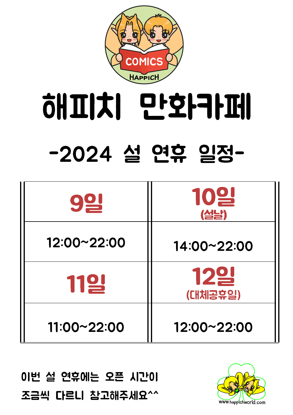 해피치 만화카페 설 연휴 일정 안내입니다^^
