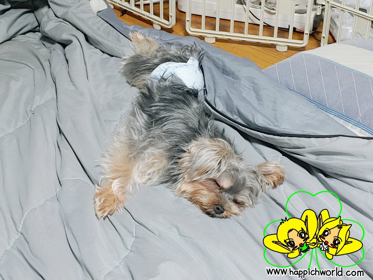 차 타고 오면서 실례를 할까봐 해피가 기저귀를 차고 왔어요.ㅎ